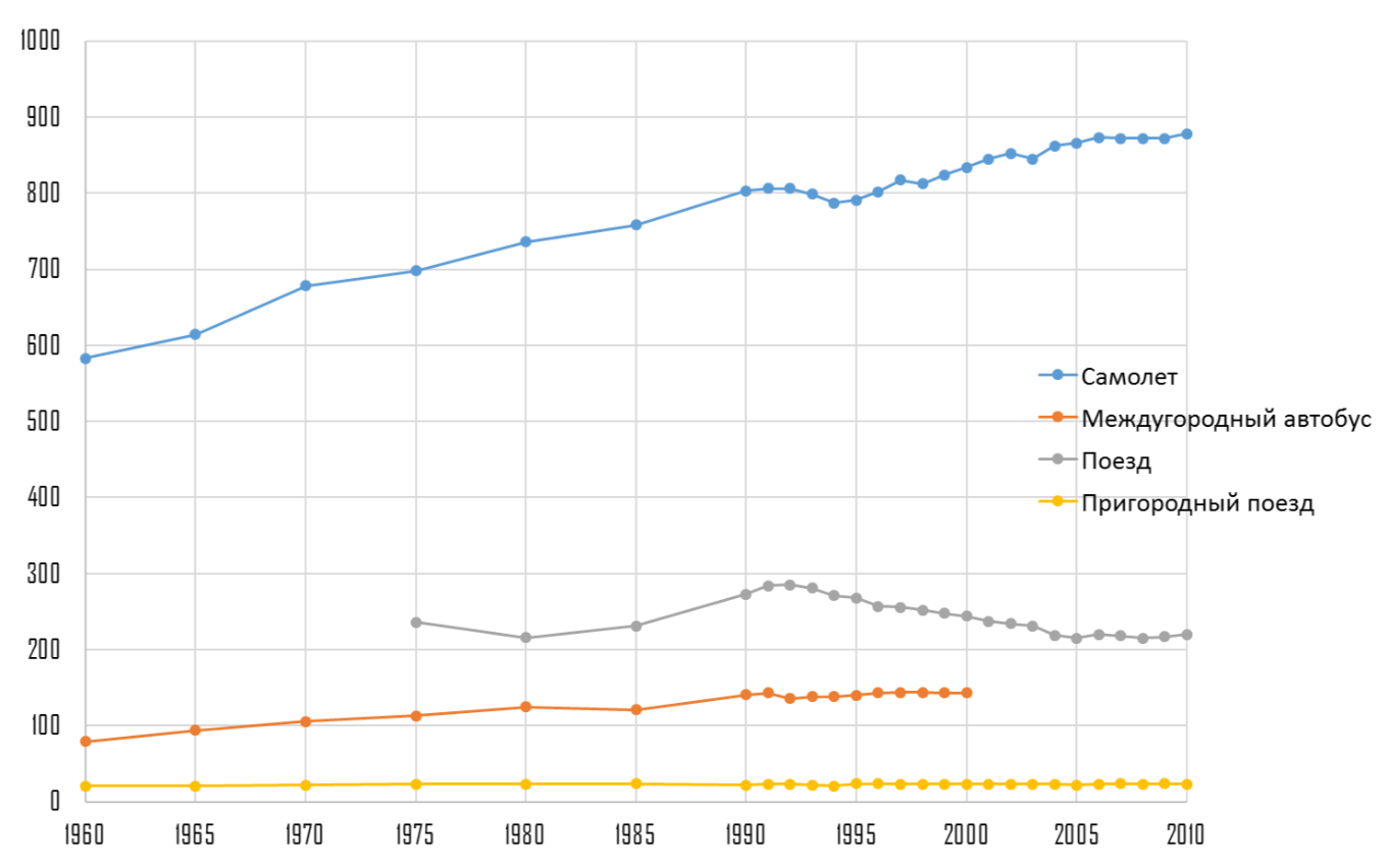 Как показывают диаграммы, большинство видов транспорта в США работает в своей нише, не мешая, а помогая друг другу. На расстояниях до 400−500 миль (650−800 км) грузы перевозят автомобили, дистанцию в 800−900 миль (1300−1450 км) «застолбили» железные дороги, а дальше или каботажное плавание, или самолеты. Похожая картина сложилась и в пассажирском транспорте.